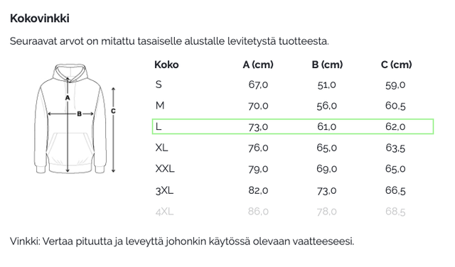 - Unisex-leikkaus: istuu miehillä vartalonmyötäisesti, naisilla väljästi (jos olet epävarma koosta, tilaa numeroa isompana tai pienempänä)